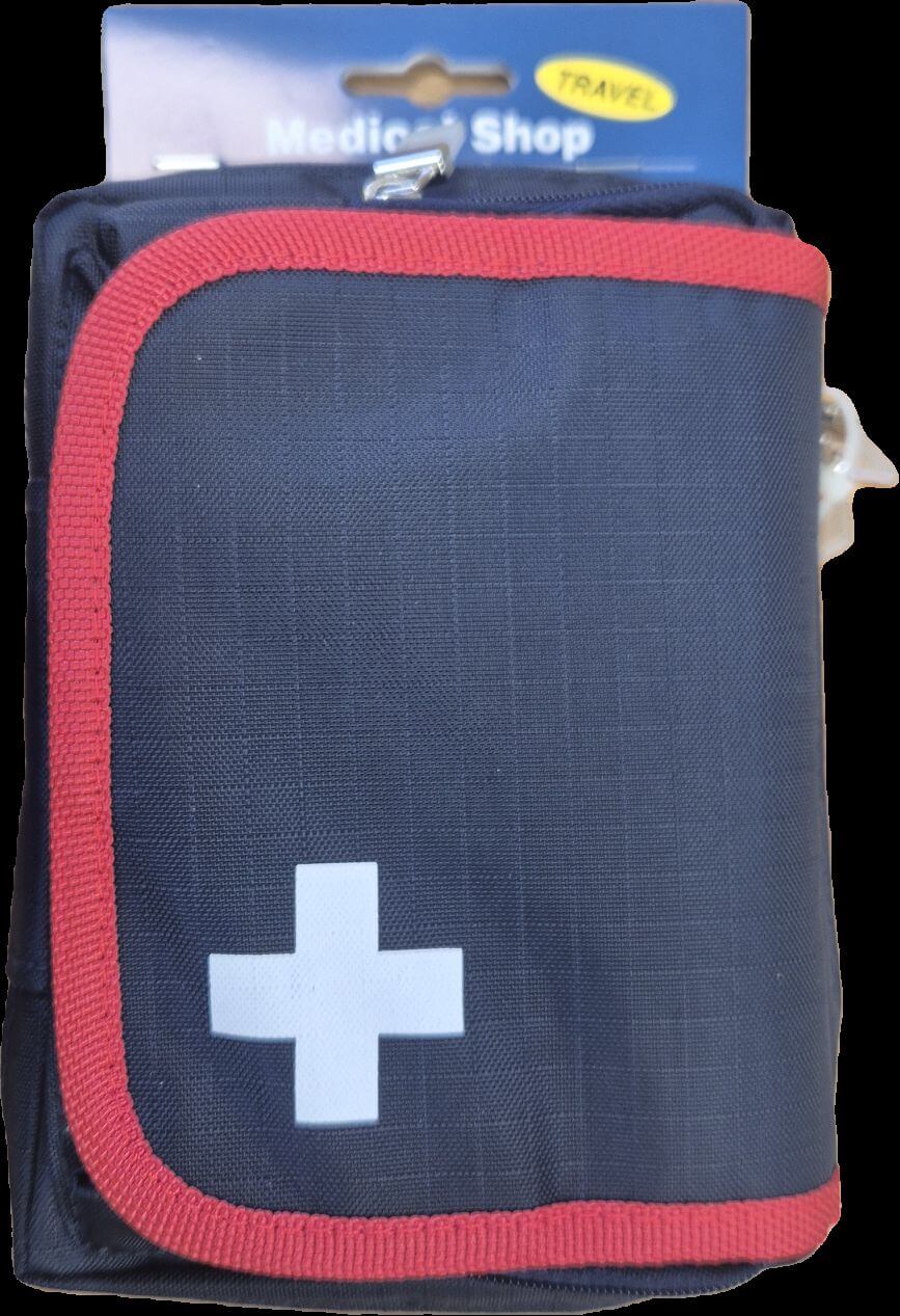Komplet prve pomoči, shranjen v priročni platneni torbici. V njej so shranjeni različni pripomočki.